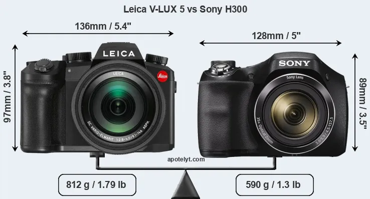 The physical size and weight of the Leica V-LUX 5 and the Sony H300 are illustrated in the side-by-side display below. The two cameras are presented according to their relative size. Three successive views from the front, the top, and the rear are shown. All width, height and depth dimensions are rounded to the nearest millimeter.