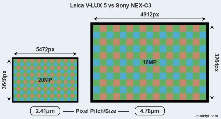 Despite having a smaller sensor, the Leica V-LUX 5 offers a higher resolution of 20 megapixels, compared with 16 MP of the Sony NEX-C3. This megapixels advantage comes at the cost of a higher pixel density and a smaller size of the individual pixel (with a pixel pitch of 2.41μm versus 4.78μm for the NEX-C3). However, it should be noted that the V-LUX 5 is much more recent (by 8 years and 1 month) than the NEX-C3, and its sensor will have benefitted from technological advances during this time that make it possible to gather light more efficiently.