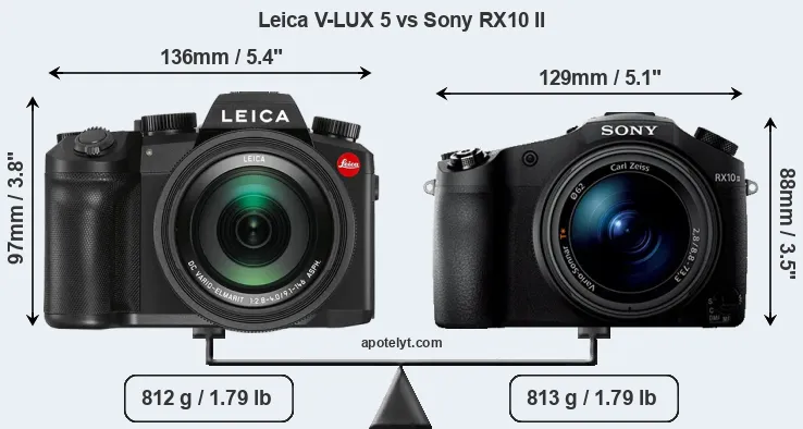 An illustration of the physical size and weight of the Leica V-LUX 5 and the Sony RX10 II is provided in the side-by-side display below. The two cameras are presented according to their relative size. Three consecutive views from the front, the top, and the rear side are shown. All width, height and depth measures are rounded to the nearest millimeter.