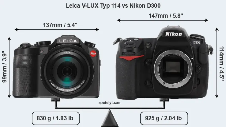 An illustration of the physical size and weight of the Leica V-LUX Typ 114 and the Nikon D300 is provided in the side-by-side display below. The two cameras are presented according to their relative size. Three consecutive views from the front, the top, and the rear side are shown. All size dimensions are rounded to the nearest millimeter.