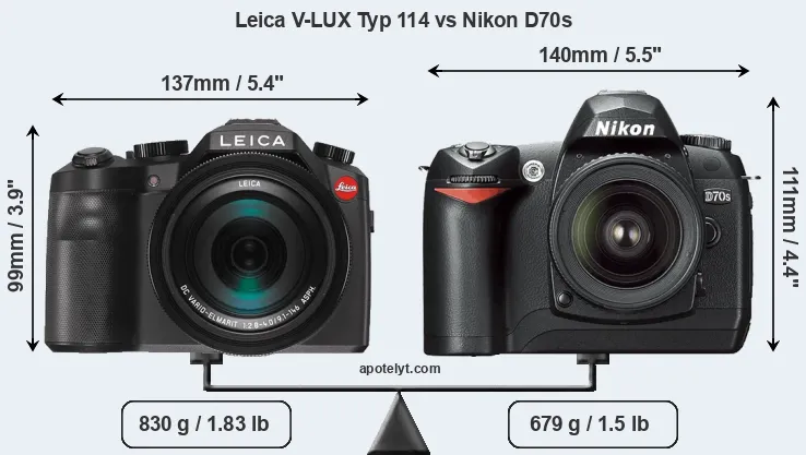 An illustration of the physical size and weight of the Leica V-LUX Typ 114 and the Nikon D70s is provided in the side-by-side display below. The two cameras are presented according to their relative size. Three consecutive views from the front, the top, and the rear side are shown. All width, height and depth measures are rounded to the nearest millimeter.