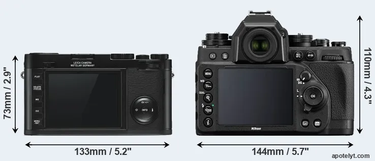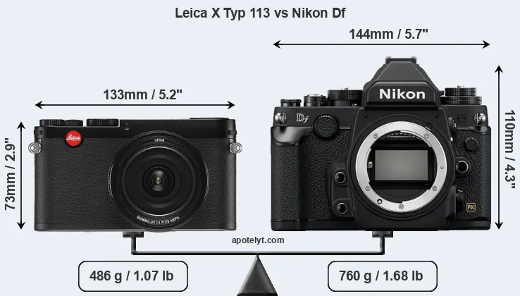 If the front view area (width x height) of the cameras is taken as an aggregate measure of their size, the Nikon Df is considerably larger (63 percent) than the Leica X Typ 113. It is noteworthy in this context that the Df is splash and dust-proof, while the X Typ 113 does not feature any corresponding weather-sealing.
