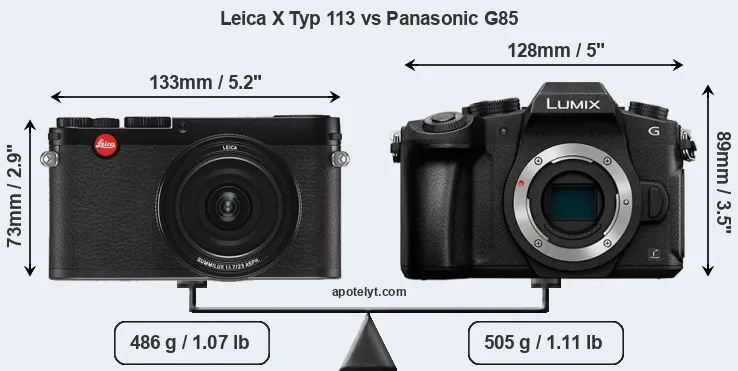 The physical size and weight of the Leica X Typ 113 and the Panasonic G85 are illustrated in the side-by-side display below. The two cameras are presented according to their relative size. Three consecutive perspectives from the front, the top, and the back are available. All width, height and depth measures are rounded to the nearest millimeter.