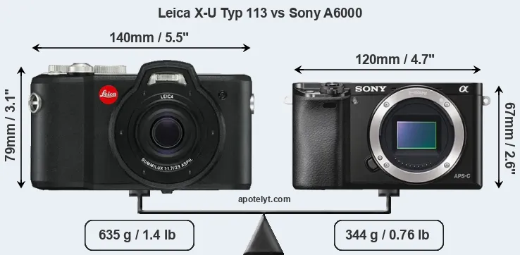 The physical size and weight of the Leica X-U Typ 113 and the Sony A6000 are illustrated in the side-by-side display below. The two cameras are presented according to their relative size. Three consecutive perspectives from the front, the top, and the back are available. All width, height and depth dimensions are rounded to the nearest millimeter.