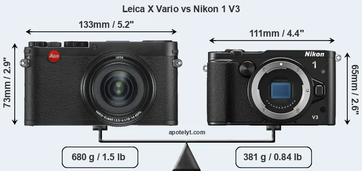 An illustration of the physical size and weight of the Leica X Vario and the Nikon 1 V3 is provided in the side-by-side display below. The two cameras are presented according to their relative size. Three consecutive perspectives from the front, the top, and the back are available. All width, height and depth measures are rounded to the nearest millimeter.