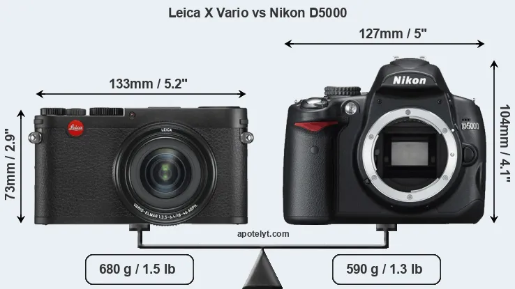 The physical size and weight of the Leica X Vario and the Nikon D5000 are illustrated in the side-by-side display below. The two cameras are presented according to their relative size. Three consecutive perspectives from the front, the top, and the back are available. All width, height and depth measures are rounded to the nearest millimeter.