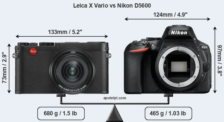The physical size and weight of the Leica X Vario and the Nikon D5600 are illustrated in the side-by-side display below. The two cameras are presented according to their relative size. Three successive views from the front, the top, and the rear are shown. All width, height and depth measures are rounded to the nearest millimeter.