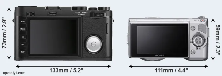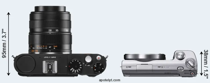 If the front view area (width x height) of the cameras is taken as an aggregate measure of their size, the Sony NEX-5 is considerably smaller (33 percent) than the Leica X Vario. In this context, it is worth noting that neither the X Vario nor the NEX-5 are weather-sealed.
