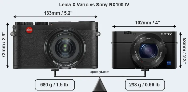 If the front view area (width x height) of the cameras is taken as an aggregate measure of their size, the Sony RX100 IV is considerably smaller (39 percent) than the Leica X Vario. Moreover, the RX100 IV is substantially lighter (56 percent) than the X Vario. In this context, it is worth noting that neither the X Vario nor the RX100 IV are weather-sealed.