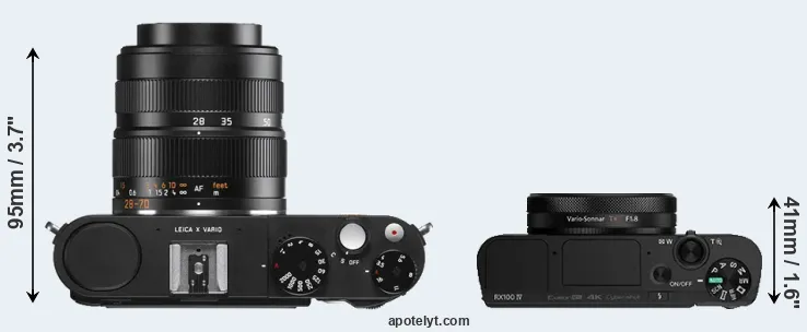 The physical size and weight of the Leica X Vario and the Sony RX100 IV are illustrated in the side-by-side display below. The two cameras are presented according to their relative size. Three consecutive views from the front, the top, and the rear side are shown. All width, height and depth measures are rounded to the nearest millimeter.
