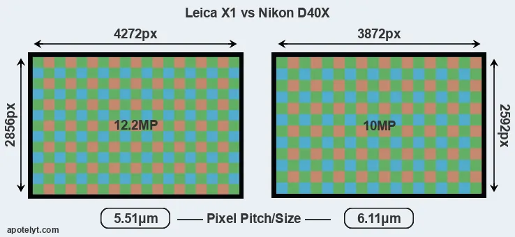Despite having a slightly smaller sensor, the Leica X1 offers a higher resolution of 12.2 megapixels, compared with 10 MP of the Nikon D40X. This megapixels advantage comes at the cost of a higher pixel density and a smaller size of the individual pixel (with a pixel pitch of 5.51μm versus 6.11μm for the D40X). However, it should be noted that the X1 is much more recent (by 2 years and 6 months) than the D40X, and its sensor will have benefitted from technological advances during this time that make it possible to gather light more efficiently.