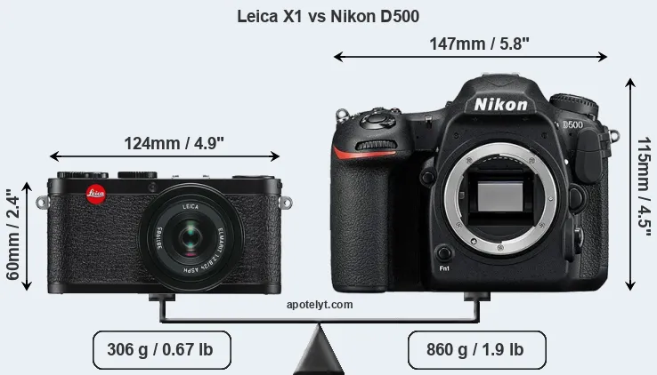 If the front view area (width x height) of the cameras is taken as an aggregate measure of their size, the Nikon D500 is considerably larger (127 percent) than the Leica X1. It is noteworthy in this context that the D500 is splash and dust-proof, while the X1 does not feature any corresponding weather-sealing.