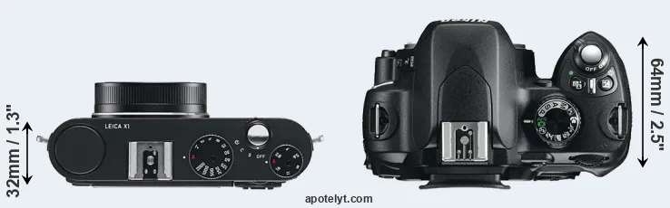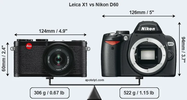 If the front view area (width x height) of the cameras is taken as an aggregate measure of their size, the Nikon D60 is considerably larger (59 percent) than the Leica X1. In this context, it is worth noting that neither the X1 nor the D60 are weather-sealed.