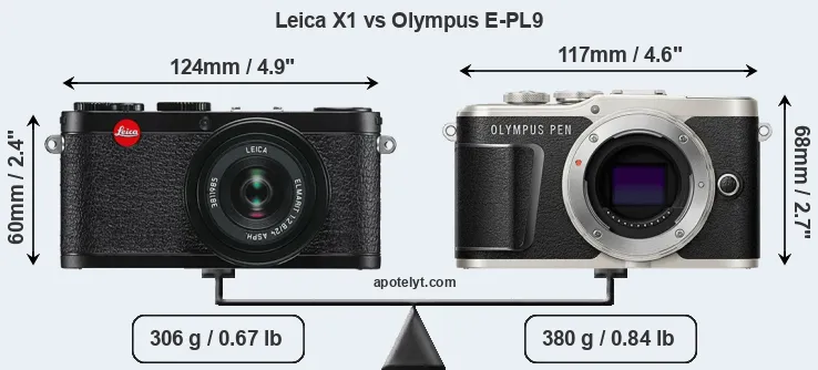 The physical size and weight of the Leica X1 and the Olympus E-PL9 are illustrated in the side-by-side display below. The two cameras are presented according to their relative size. Three successive views from the front, the top, and the rear are shown. All width, height and depth dimensions are rounded to the nearest millimeter.