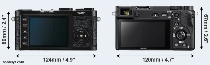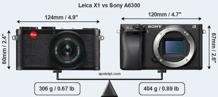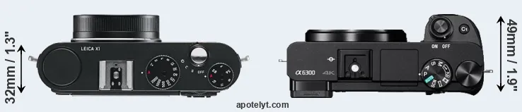 The side-by-side display below illustrates the physical size and weight of the Leica X1 and the Sony A6300. The two cameras are presented according to their relative size. Three consecutive perspectives from the front, the top, and the back are available. All width, height and depth dimensions are rounded to the nearest millimeter.