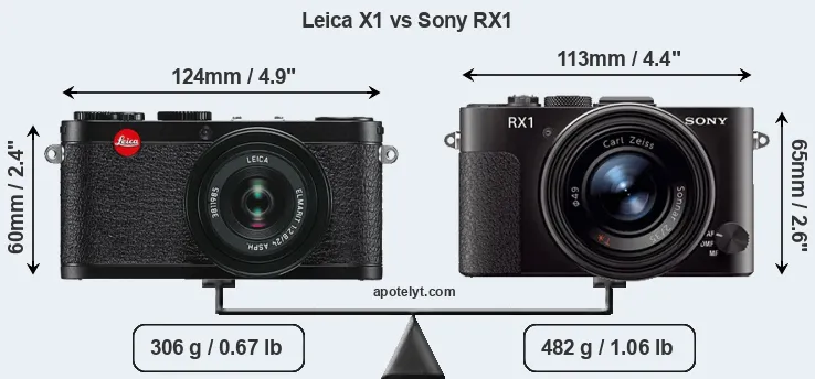 If the front view area (width x height) of the cameras is taken as an aggregate measure of their size, the Sony RX1 is somewhat smaller (1 percent) than the Leica X1. However, the RX1 is substantially heavier (58 percent) than the X1. In this context, it is worth noting that neither the X1 nor the RX1 are weather-sealed.