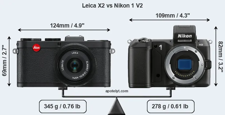 The side-by-side display below illustrates the physical size and weight of the Leica X2 and the Nikon 1 V2. The two cameras are presented according to their relative size. Three consecutive perspectives from the front, the top, and the back are available. All width, height and depth measures are rounded to the nearest millimeter.