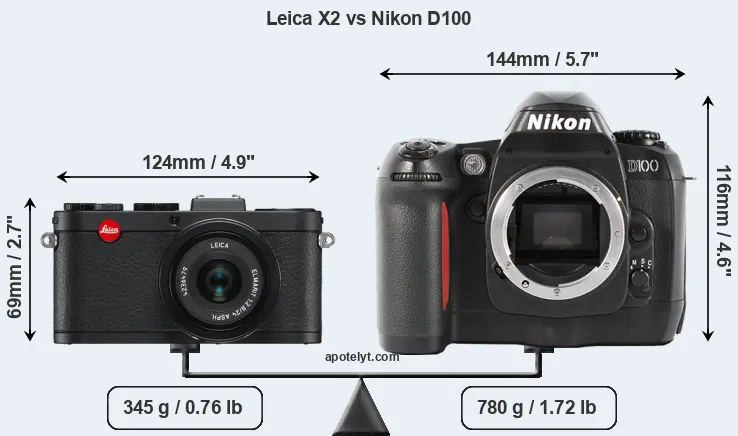An illustration of the physical size and weight of the Leica X2 and the Nikon D100 is provided in the side-by-side display below. The two cameras are presented according to their relative size. Three consecutive views from the front, the top, and the rear side are shown. All width, height and depth measures are rounded to the nearest millimeter.