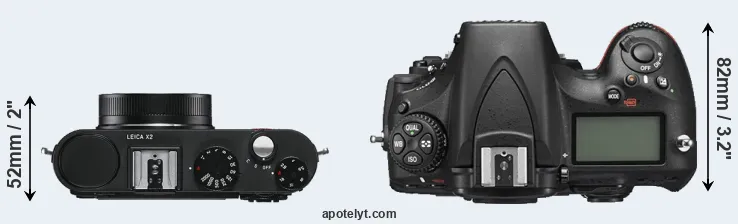 The side-by-side display below illustrates the physical size and weight of the Leica X2 and the Nikon D810. The two cameras are presented according to their relative size. Three consecutive perspectives from the front, the top, and the back are available. All width, height and depth measures are rounded to the nearest millimeter.
