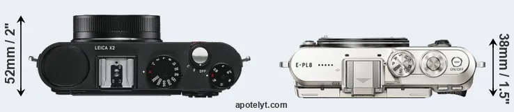 If the front view area (width x height) of the cameras is taken as an aggregate measure of their size, the Olympus E-PL8 is notably smaller (10 percent) than the Leica X2. In this context, it is worth noting that neither the X2 nor the E-PL8 are weather-sealed.