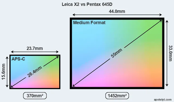 Of the two cameras under consideration, the Leica X2 features an APS-C sensor and the Pentax 645D a medium format sensor. The sensor area in the 645D is 292 percent bigger. As a result of these sensor size differences, the cameras have a format factor of, respectively, 1.5 and 0.79. The sensor in the X2 has a native 3:2 aspect ratio, while the one in the 645D offers a 4:3 aspect.