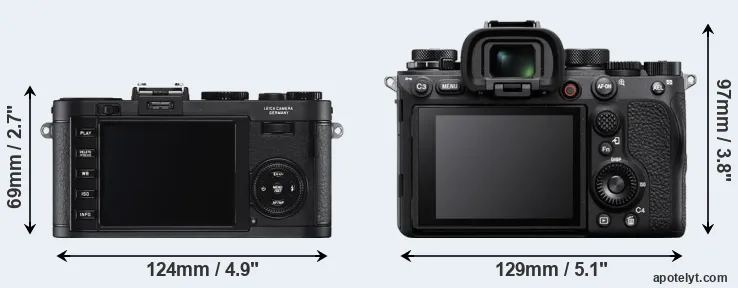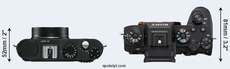 The side-by-side display below illustrates the physical size and weight of the Leica X2 and the Sony A1. The two cameras are presented according to their relative size. Three successive views from the front, the top, and the rear are shown. All width, height and depth dimensions are rounded to the nearest millimeter.