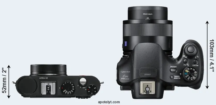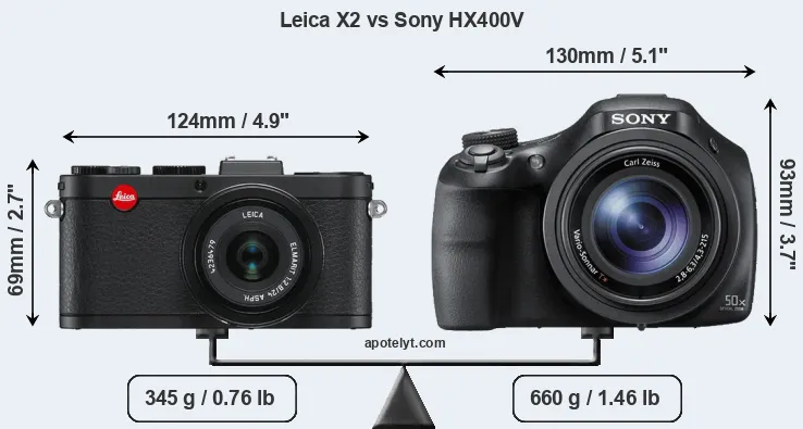 The physical size and weight of the Leica X2 and the Sony HX400V are illustrated in the side-by-side display below. The two cameras are presented according to their relative size. Three consecutive perspectives from the front, the top, and the back are available. All width, height and depth measures are rounded to the nearest millimeter.
