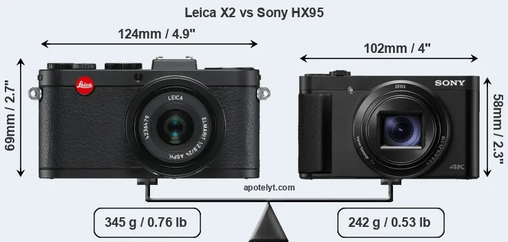 If the front view area (width x height) of the cameras is taken as an aggregate measure of their size, the Sony HX95 is considerably smaller (31 percent) than the Leica X2. Moreover, the HX95 is markedly lighter (30 percent) than the X2. In this context, it is worth noting that neither the X2 nor the HX95 are weather-sealed.