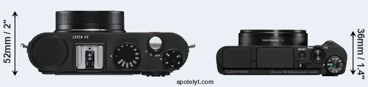 The physical size and weight of the Leica X2 and the Sony HX95 are illustrated in the side-by-side display below. The two cameras are presented according to their relative size. Three consecutive views from the front, the top, and the rear side are shown. All size dimensions are rounded to the nearest millimeter.