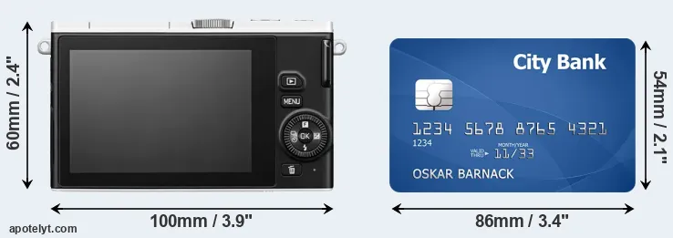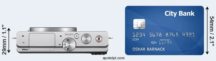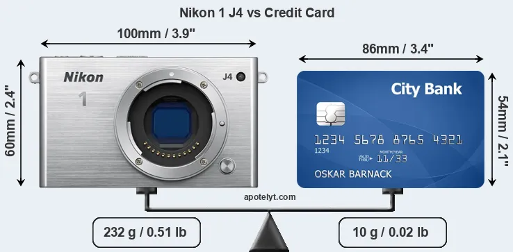 The side-by-side display below illustrates the physical size of the Nikon 1 J4 vis-à-vis a credit card. Three consecutive perspectives from the front, the top, and the back are presented. All width, height and depth measures are rounded to the nearest millimeter.