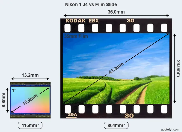 The Nikon 1 J4 features an one-inch sensor and has a format factor (sometimes also referred to as "crop factor") of 2.7. Within the spectrum of camera sensors, this places the Nikon 1 J4 among the medium-sized sensor cameras that aim to strike a balance between image quality and portability.