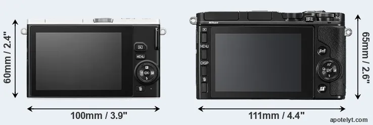 The side-by-side display below illustrates the physical size and weight of the Nikon 1 J4 and the Nikon 1 V3. The two cameras are presented according to their relative size. Three successive views from the front, the top, and the rear are shown. All size dimensions are rounded to the nearest millimeter.