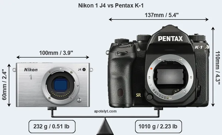 If the front view area (width x height) of the cameras is taken as an aggregate measure of their size, the Pentax K-1 is considerably larger (151 percent) than the Nikon 1 J4. Moreover, the K-1 is substantially heavier (335 percent) than the J4. It is noteworthy in this context that the K-1 is splash and dust-proof, while the J4 does not feature any corresponding weather-sealing.