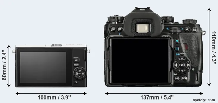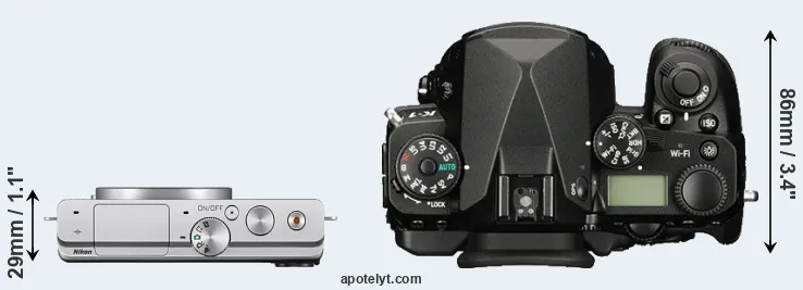 The side-by-side display below illustrates the physical size and weight of the Nikon 1 J4 and the Pentax K-1. The two cameras are presented according to their relative size. Three consecutive views from the front, the top, and the rear side are shown. All width, height and depth dimensions are rounded to the nearest millimeter.