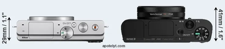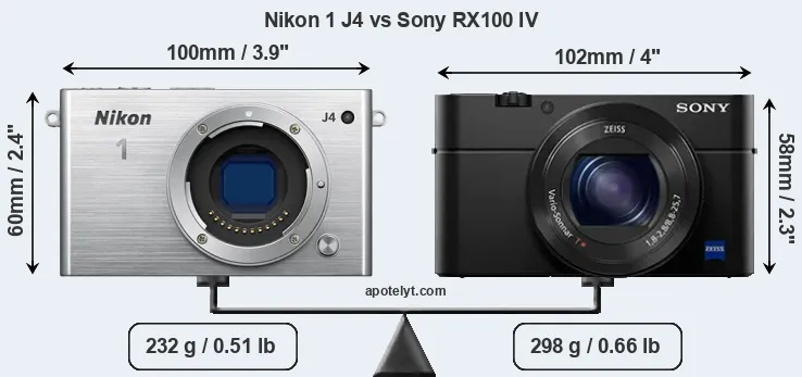 The side-by-side display below illustrates the physical size and weight of the Nikon 1 J4 and the Sony RX100 IV. The two cameras are presented according to their relative size. Three consecutive views from the front, the top, and the rear side are shown. All width, height and depth measures are rounded to the nearest millimeter.