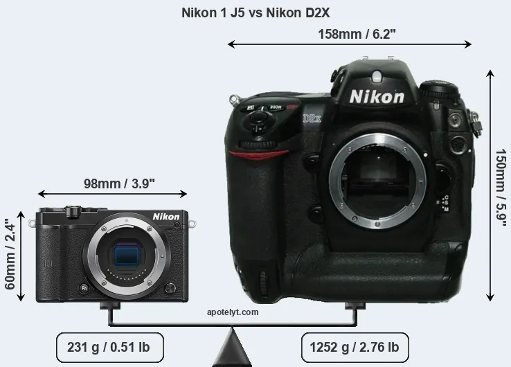 If the front view area (width x height) of the cameras is taken as an aggregate measure of their size, the Nikon D2X is considerably larger (303 percent) than the Nikon 1 J5. Moreover, the D2X is substantially heavier (442 percent) than the J5. It is noteworthy in this context that the D2X is splash and dust-proof, while the J5 does not feature any corresponding weather-sealing.