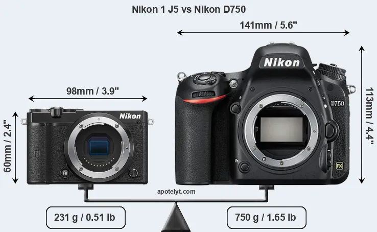 If the front view area (width x height) of the cameras is taken as an aggregate measure of their size, the Nikon D750 is considerably larger (171 percent) than the Nikon 1 J5. Moreover, the D750 is substantially heavier (225 percent) than the J5. It is noteworthy in this context that the D750 is splash and dust-proof, while the J5 does not feature any corresponding weather-sealing.