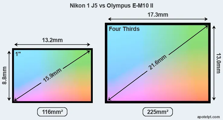 Of the two cameras under consideration, the Nikon 1 J5 features an one-inch sensor and the Olympus E-M10 II a Four Thirds sensor. The sensor area in the E-M10 II is 94 percent bigger. As a result of these sensor size differences, the cameras have a format factor of, respectively, 2.7 and 2.0. The sensor in the J5 has a native 3:2 aspect ratio, while the one in the E-M10 II offers a 4:3 aspect.