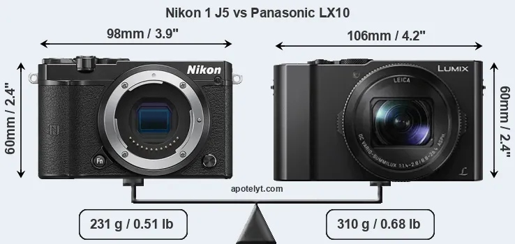 The side-by-side display below illustrates the physical size and weight of the Nikon 1 J5 and the Panasonic LX10. The two cameras are presented according to their relative size. Three successive views from the front, the top, and the rear are shown. All width, height and depth measures are rounded to the nearest millimeter.