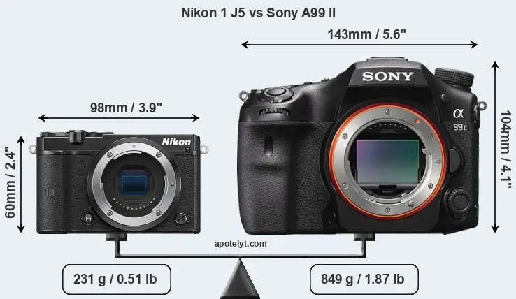 If the front view area (width x height) of the cameras is taken as an aggregate measure of their size, the Sony A99 II is considerably larger (153 percent) than the Nikon 1 J5. Moreover, the A99 II is substantially heavier (268 percent) than the J5. It is noteworthy in this context that the A99 II is splash and dust-proof, while the J5 does not feature any corresponding weather-sealing.