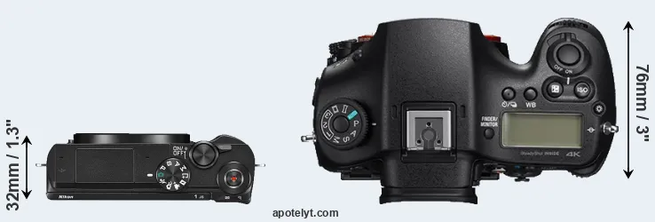 The physical size and weight of the Nikon 1 J5 and the Sony A99 II are illustrated in the side-by-side display below. The two cameras are presented according to their relative size. Three consecutive views from the front, the top, and the rear side are shown. All width, height and depth dimensions are rounded to the nearest millimeter.