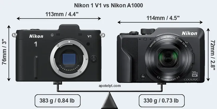 An illustration of the physical size and weight of the Nikon 1 V1 and the Nikon A1000 is provided in the side-by-side display below. The two cameras are presented according to their relative size. Three consecutive views from the front, the top, and the rear side are shown. All size dimensions are rounded to the nearest millimeter.