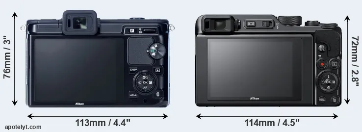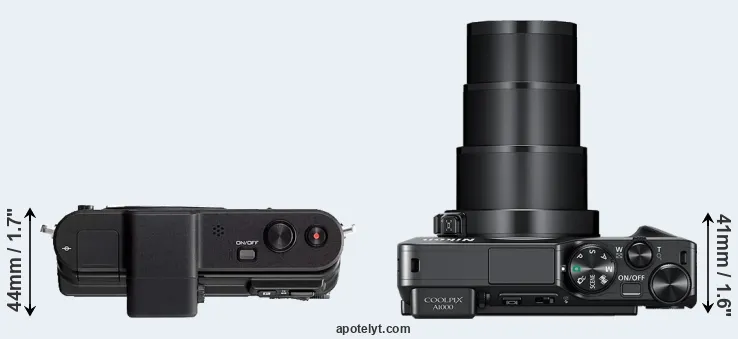 If the front view area (width x height) of the cameras is taken as an aggregate measure of their size, the Nikon A1000 is somewhat smaller (4 percent) than the Nikon 1 V1. In this context, it is worth noting that neither the V1 nor the A1000 are weather-sealed.