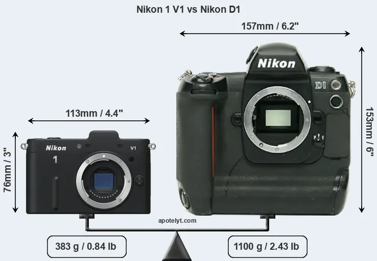 If the front view area (width x height) of the cameras is taken as an aggregate measure of their size, the Nikon D1 is considerably larger (180 percent) than the Nikon 1 V1. Moreover, the D1 is substantially heavier (187 percent) than the V1. It is noteworthy in this context that the D1 is splash and dust-proof, while the V1 does not feature any corresponding weather-sealing.