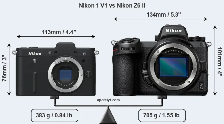 If the front view area (width x height) of the cameras is taken as an aggregate measure of their size, the Nikon Z6 II is considerably larger (58 percent) than the Nikon 1 V1. Moreover, the Z6 II is substantially heavier (84 percent) than the V1. It is noteworthy in this context that the Z6 II is splash and dust-proof, while the V1 does not feature any corresponding weather-sealing.