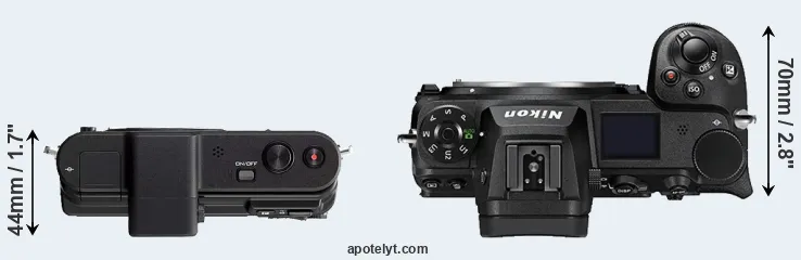The physical size and weight of the Nikon 1 V1 and the Nikon Z6 II are illustrated in the side-by-side display below. The two cameras are presented according to their relative size. Three successive views from the front, the top, and the rear are shown. All width, height and depth dimensions are rounded to the nearest millimeter.