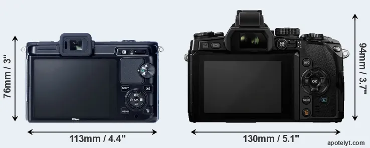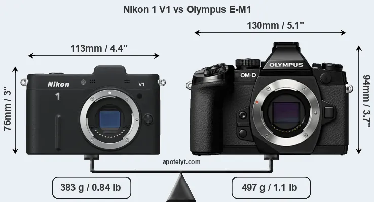 The side-by-side display below illustrates the physical size and weight of the Nikon 1 V1 and the Olympus E-M1. The two cameras are presented according to their relative size. Three consecutive perspectives from the front, the top, and the back are available. All width, height and depth measures are rounded to the nearest millimeter.
