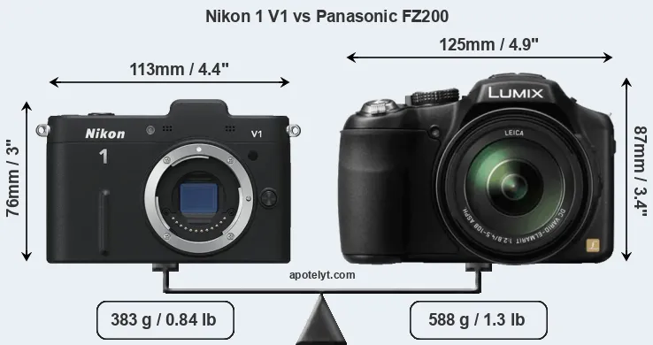 An illustration of the physical size and weight of the Nikon 1 V1 and the Panasonic FZ200 is provided in the side-by-side display below. The two cameras are presented according to their relative size. Three successive views from the front, the top, and the rear are shown. All width, height and depth measures are rounded to the nearest millimeter.