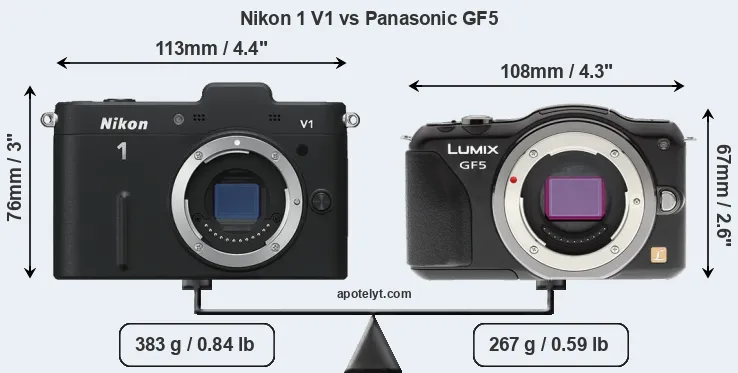 An illustration of the physical size and weight of the Nikon 1 V1 and the Panasonic GF5 is provided in the side-by-side display below. The two cameras are presented according to their relative size. Three successive views from the front, the top, and the rear are shown. All width, height and depth dimensions are rounded to the nearest millimeter.