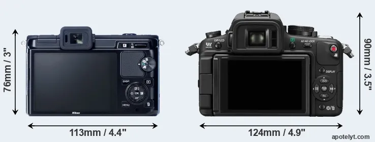 The side-by-side display below illustrates the physical size and weight of the Nikon 1 V1 and the Panasonic GH1. The two cameras are presented according to their relative size. Three consecutive views from the front, the top, and the rear side are shown. All size dimensions are rounded to the nearest millimeter.